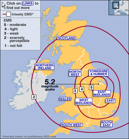 Wiki- The 2008 Market Rasen earthquake occurred at 00:56:47.8s GMT on 27 February 2008. According to the British Geological Survey the earthquake registered a reading of 5.2 on the Richter scale, with its epicentre 2.5 miles (4 km) north of Market Rasen and 15 miles (24 km) south-west of Grimsby.