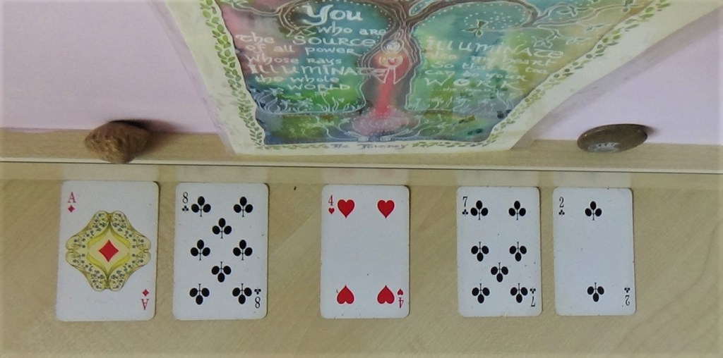 4 Hearts: a happy environment. I was mightily relieved to see this card sitting centrally. Junior Sprog had a horrible time, in one of her two school placements in a school dominated, if not terrorized by a toxic headteacher. It was a shocker, and the only good thing one could say was, it did not defeat her, and she faced it down and passed the placement despite that headteacher’s expressed determination from the outset, from the very second day, that Junior Sprog would fail the placement.