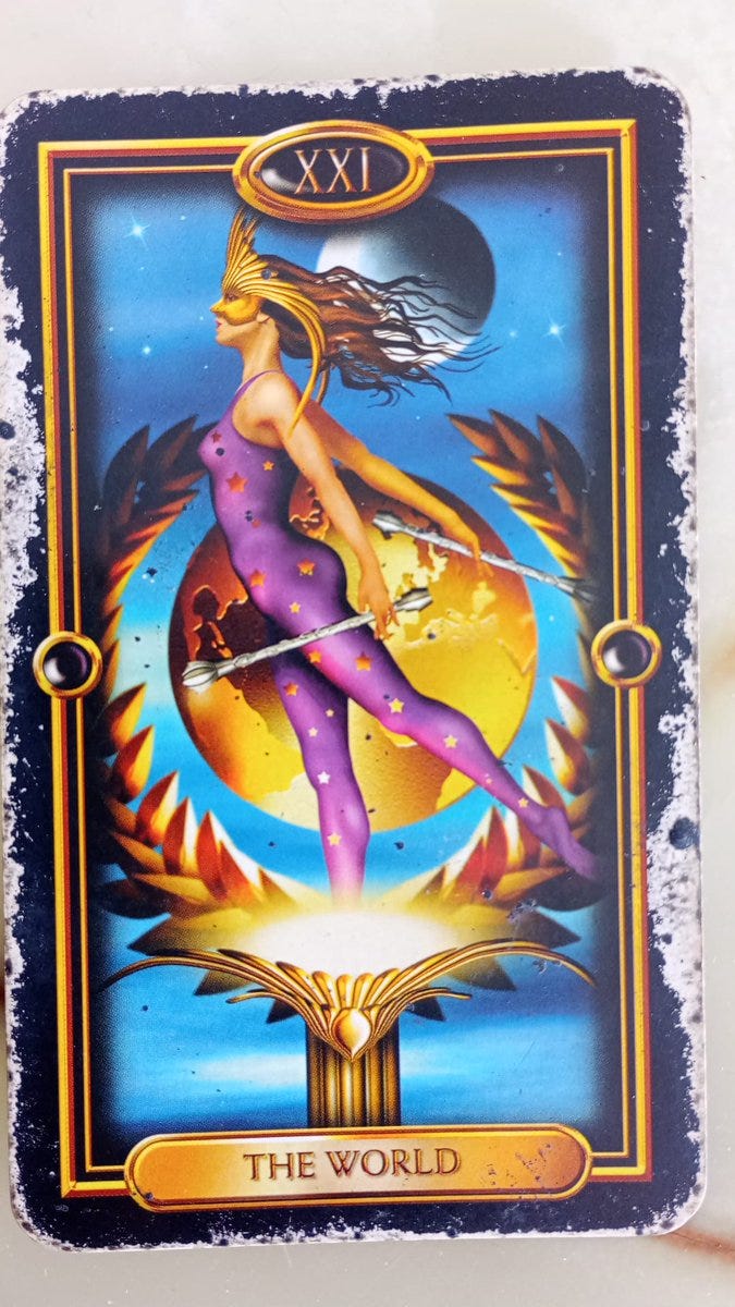 This World card is from The Gilded Tarot illustrated by Ciro Marchetti. This was one of my go-to working decks when I started reading professionally back in the noughties. A hard-worked deck of cards, as you can tell, but now relaxing in its box.