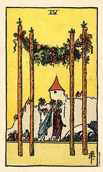 The Four of Wands when read as a standalone is talking about achievement, excellence, professional advancement, houses, hotels, entertainment venues, property improvements, organized events, gatherings, weddings and other celebrations. I have also known it to talk specifically about fitting new kitchens, and installing central heating, and you can see why when you look at the image on the right; the Four of Wands from the Legacy of The Divine Tarot. As I am typing this, two big vans are parked across the courtyard outside a new neighbour’s place. The legend on the vans… “All fired up to fit your boiler.”