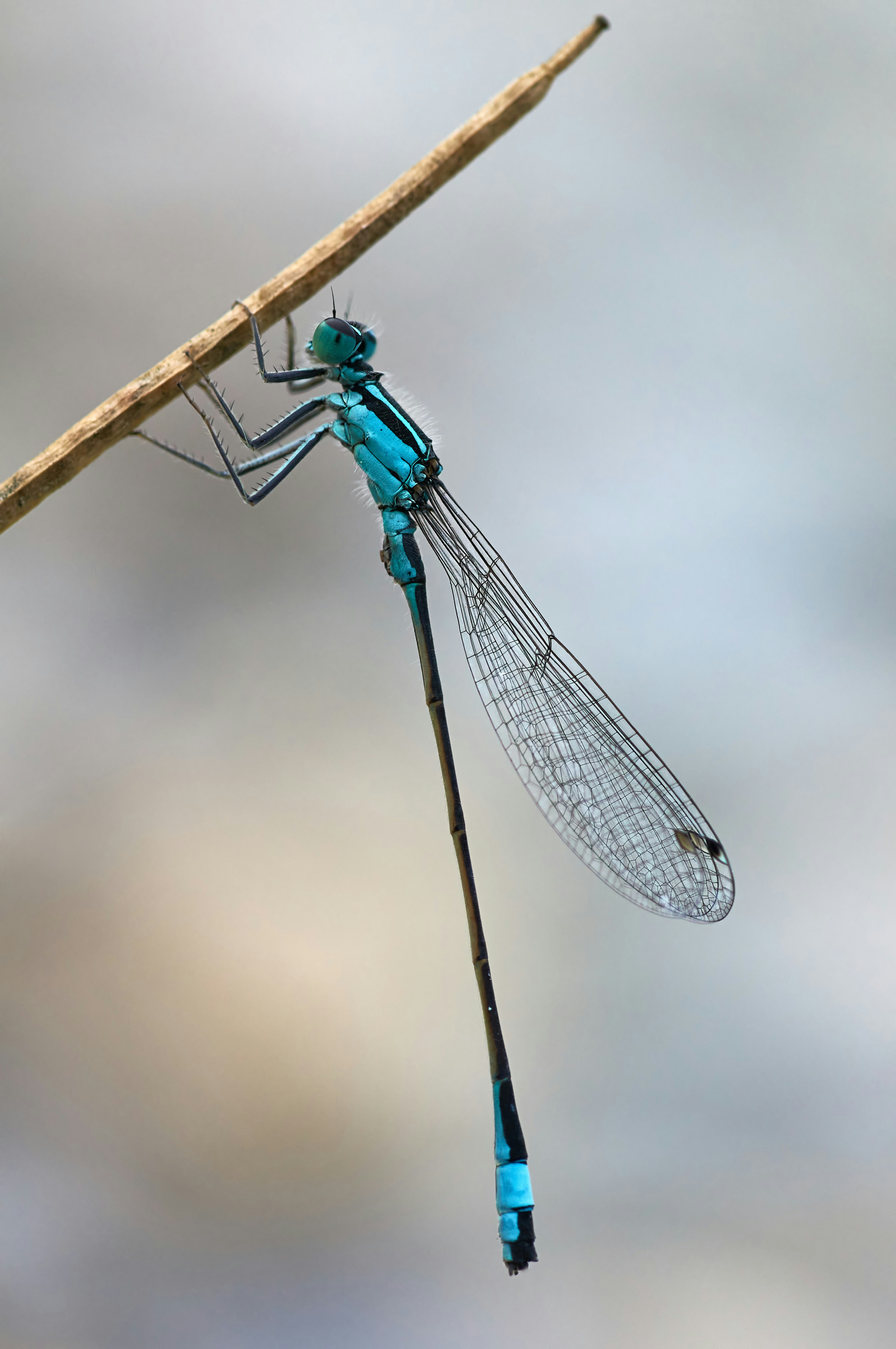 A warrior of Air, a gigantic human dragonfly, an armed angel wearing blue.